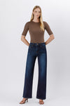 COMFORT STRETCH DENIM, SUPER HIGH RISE WAIST, 90'S VINTAGE STYLE, 5 POCKETS, FINISHED HEM, FULL LENGTH, DARK WASH, LOOSE JEANS