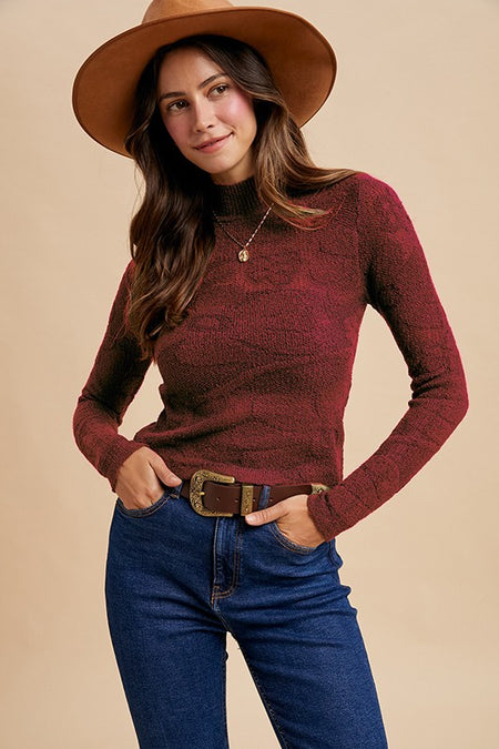 Burgundy Floral Jacquard Textured Mock Neck Sweater Top