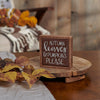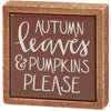 A small wooden box sign from our Fall & Harvest Collection displaying a fun fall inspired sentiment in a unique hand illustrated style that reads "Autumn Leaves & Pumpkin Please." Box sign features a natural wood frame and faux enamel finish behind design for a tile-like appearance. Our Autumn Leaves mini sign is easy to hang or can free-stand alone. A fun gift perfect as a seasonal home accent that can easily blend into any display. 4x4x1".