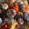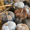 Measurements: 5" W x 3" T Medium Pecan Velvet Fabric Pumpkin with Curved Jute Wrapped Stem and Jute Strings.