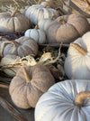 Measurements: 5" W x 3" T Medium Tan Fuzzy Fabric Pumpkin with Curved Jute Wrapped Stem and Jute Strings.