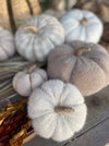 Measurements: 7" W x 4" T Tan, Fuzzy Fabric Stuffed Pumpkin with Jute Wrapped Stem
