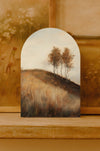 Soft painterly landscape with a cluster of trees atop a golden hillside, capturing the stillness of a crisp fall afternoon. UV printed on ¼" wood with arched top. Back is unfinished maple with branded stamp. Meant to lean; base sold separately. A peaceful addition to fall decor 2025.