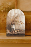 A soft fall vignette with a stoneware jug of dried grasses, scattered leaves, and a rustic black cup. UV printed on ¼" wood with arched top. Back is unfinished maple with branded stamp. Meant to lean; base sold separately. A timeless accent for fall decor 2025.