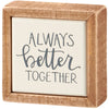 A small wooden box sign from our Hand Illustrated Collection displaying a love inspired sentiment in a unique hand illustrated style that reads "Always Better Together." Box sign features a natural wood frame and faux enamel finish behind design for a tile-like appearance. Our Always Better Togther mini sign is easy to hang or can free-stand alone. A lovely gift perfect as an everyday home accent that can easily blend into any display.