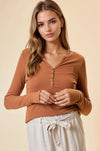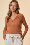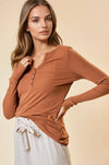 HENLEY KNIT TOP - Classic Henley style with button placket - Lightweight and breathable material - Ribbed cuffs and hem for a polished look - Ideal for casual everyday wear STYLE MEASUREMENTS (SIZE SMALL) - TOTAL LENGTH 26" - BUST 16 3/4" - WAIST 15" - SLEEVE LENGTH 27" - SHOULDER 14" 46%RAYON, 46%POLYESTER, 8%SPANDEX MODEL IS 5'10" | BUST 34" | WAIST 24" | HIPS 35" WEARING SIZE S
